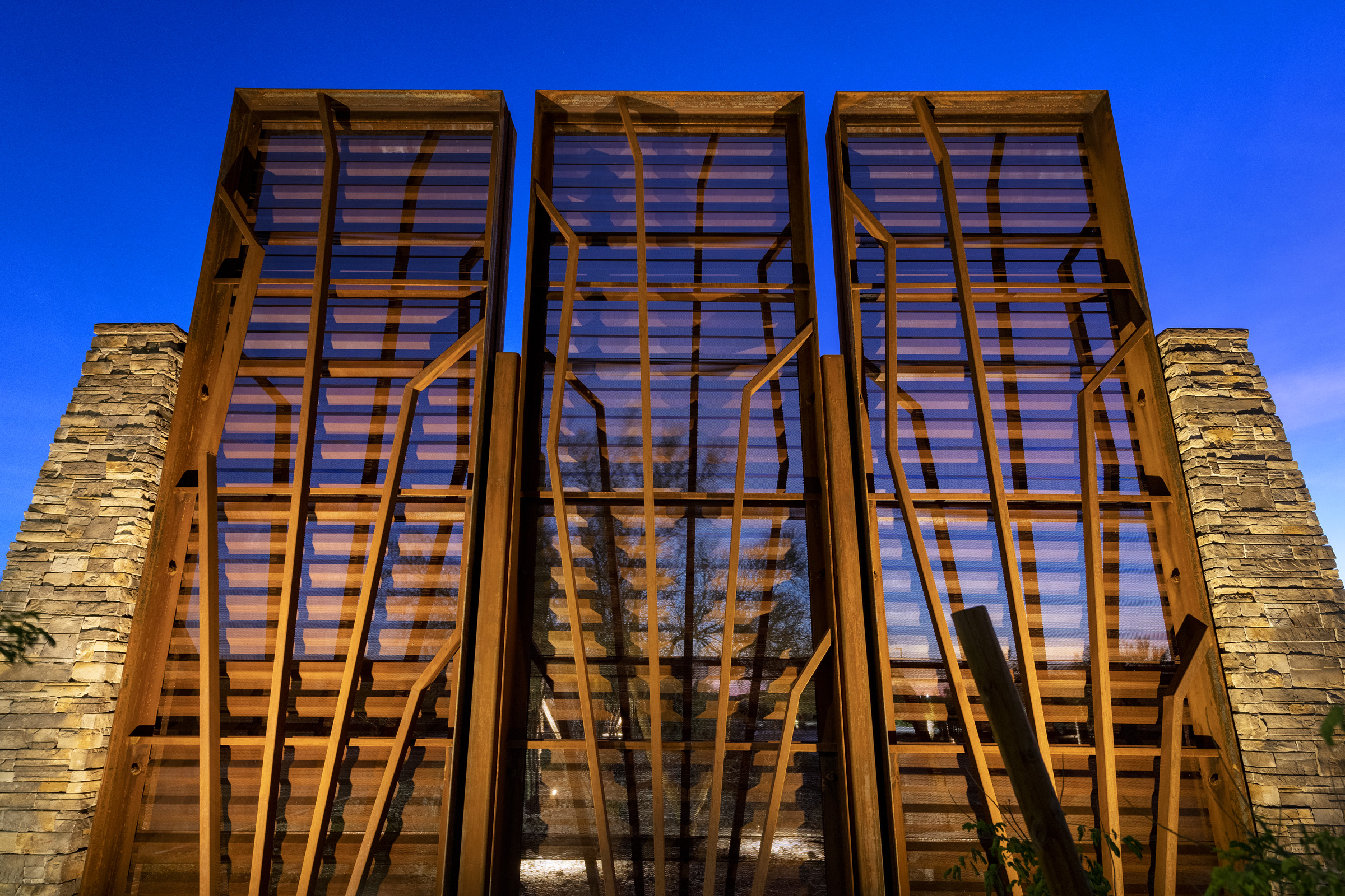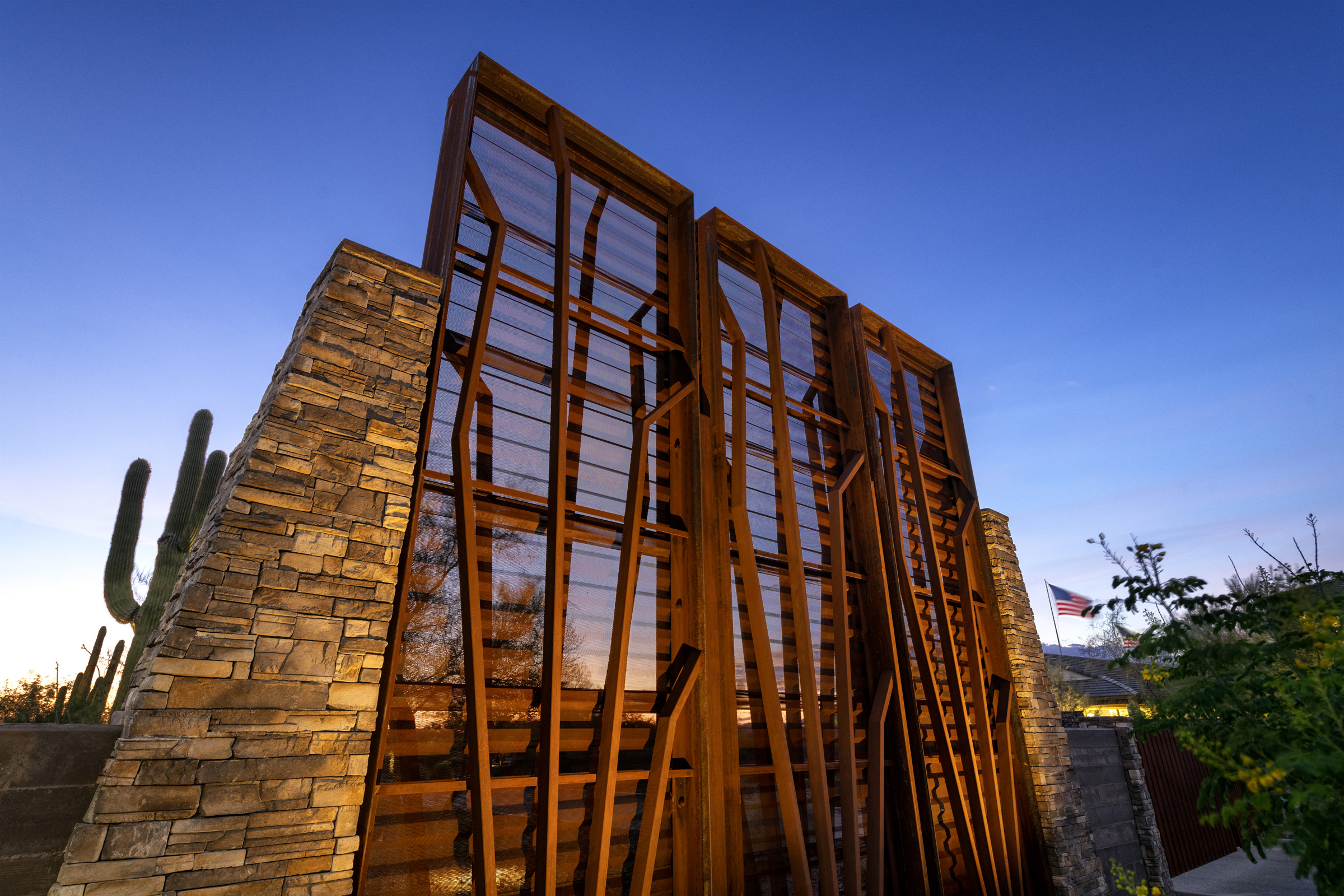 Front the moment you drive up to the Sonoran Gate community, you cannot help but notice the amazing landscape architecture that has been brought to life by Sargon Steel & Sargon Masonry. Sargon Steel was responsible for the oversized community ramada, entry gates, steel entry monuments, restroom enclosures, shade structures, view fencing and gabion baskets. Sargon Masonry was responsible for community and entry monuments, community restrooms, double-sided oversized fireplace, cast-in-place seat wall, raised planter, gabion baskets, mailbox enclosures, theme walls, view walls, and retaining walls.