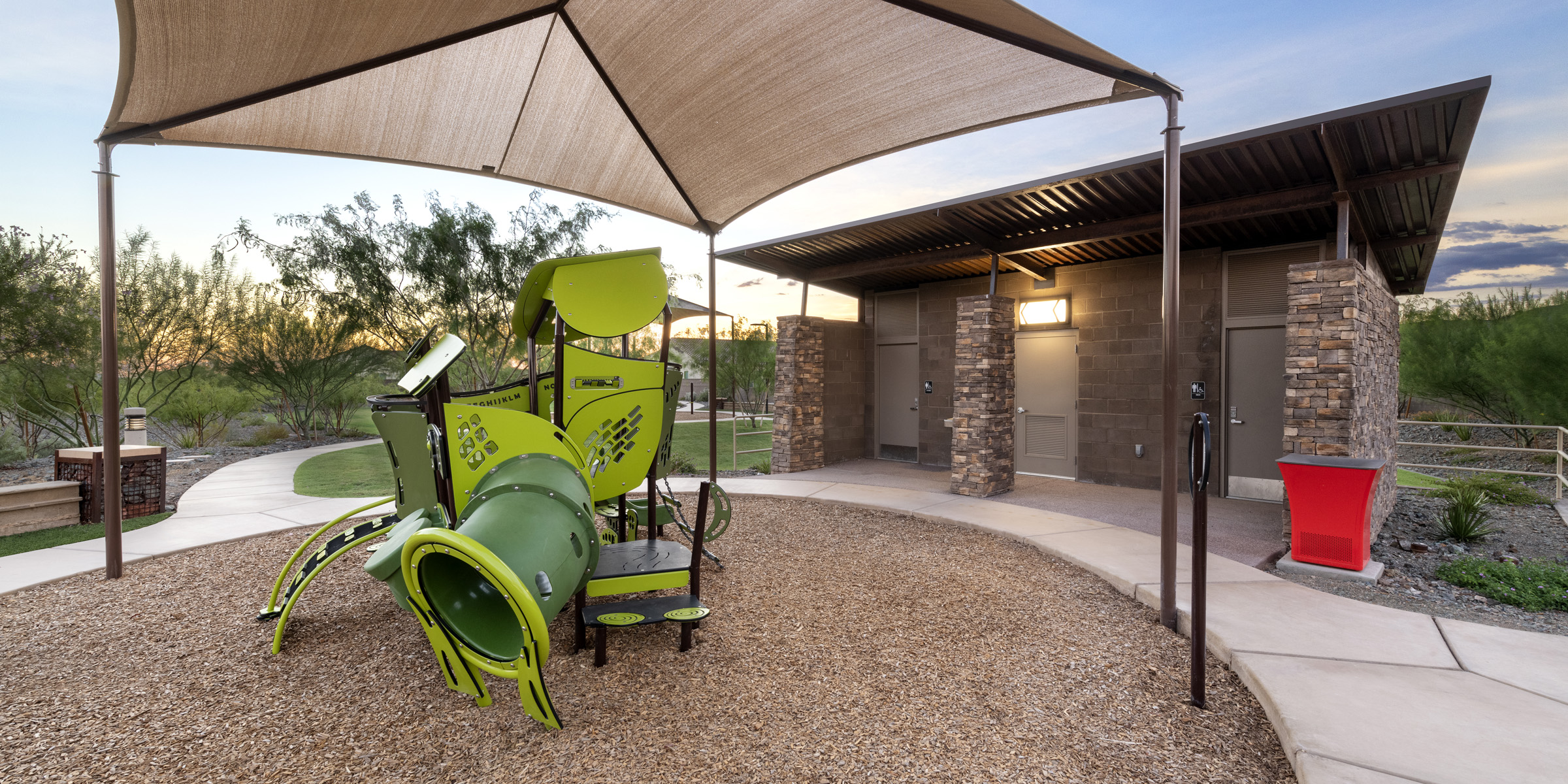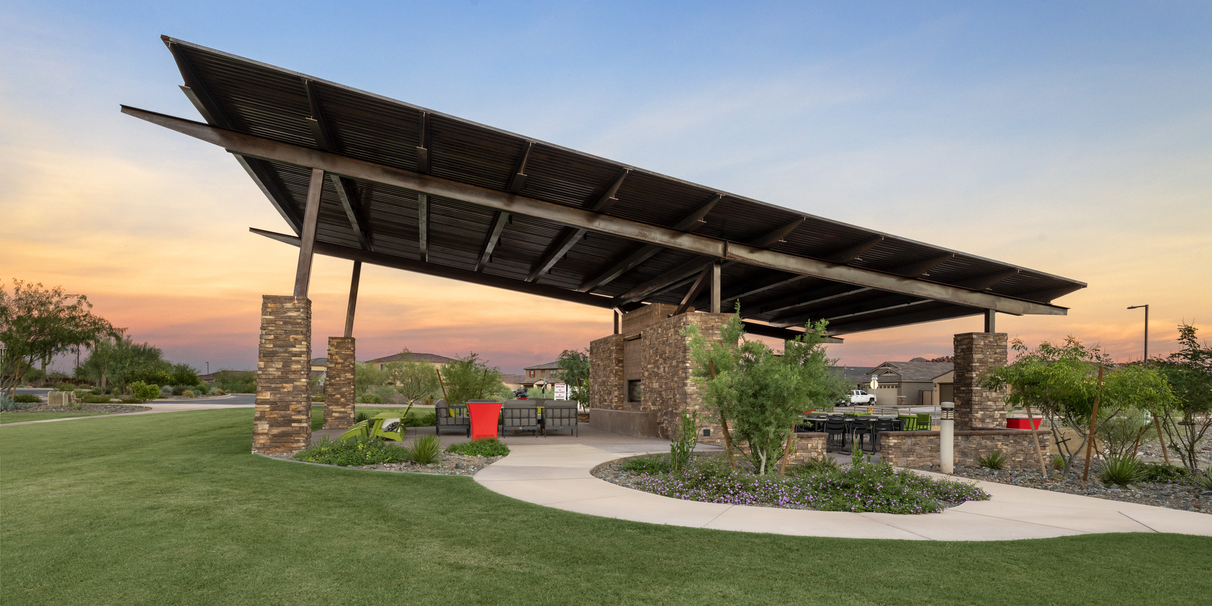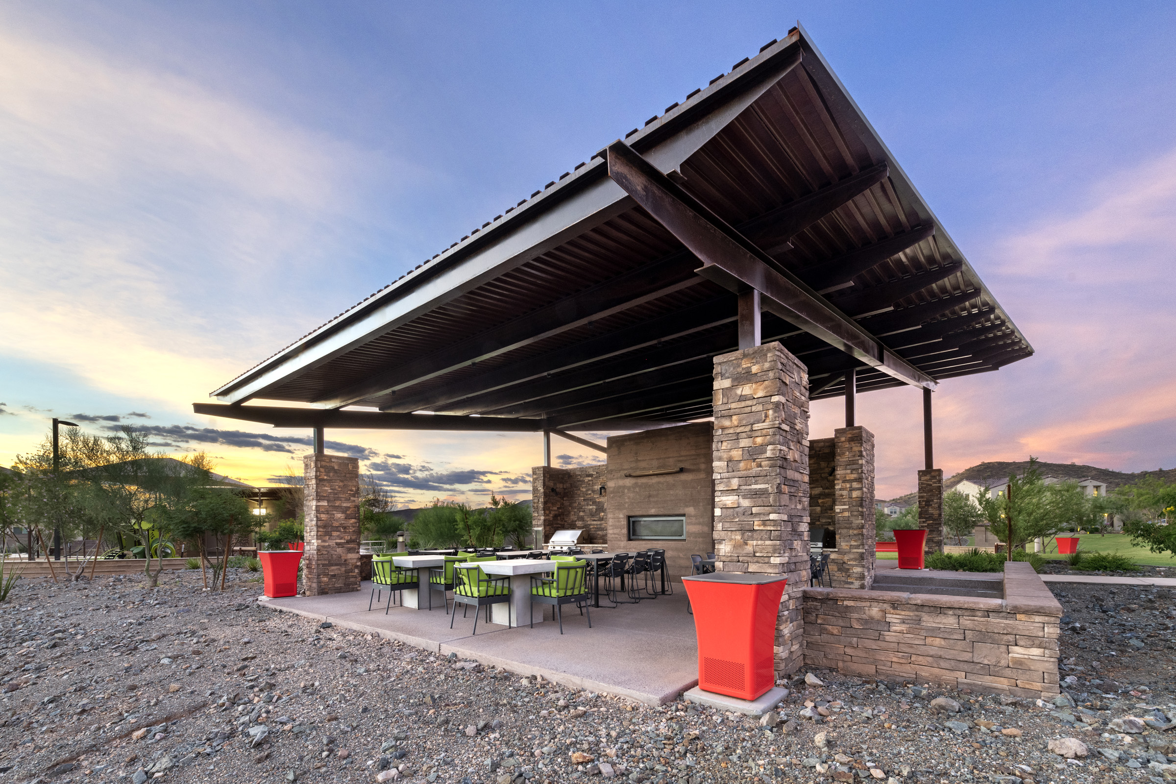 Front the moment you drive up to the Sonoran Gate community, you cannot help but notice the amazing landscape architecture that has been brought to life by Sargon Steel & Sargon Masonry. Sargon Steel was responsible for the oversized community ramada, entry gates, steel entry monuments, restroom enclosures, shade structures, view fencing and gabion baskets. Sargon Masonry was responsible for community and entry monuments, community restrooms, double-sided oversized fireplace, cast-in-place seat wall, raised planter, gabion baskets, mailbox enclosures, theme walls, view walls, and retaining walls.